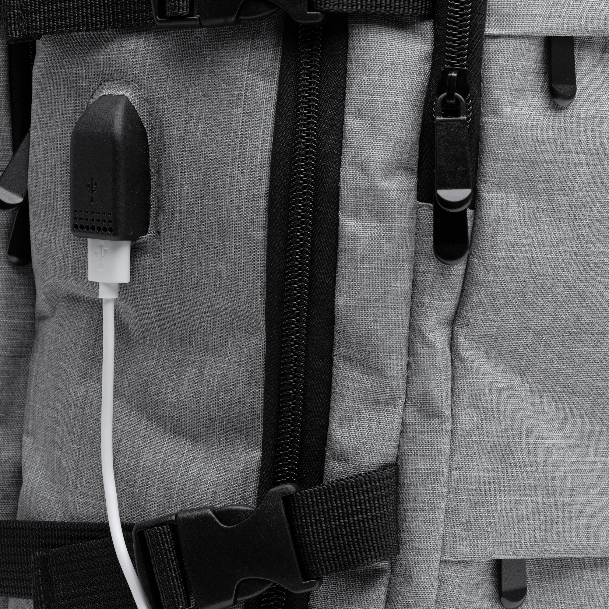 Mochila de viaje realizada en poliéster reciclado RPET, diseñada para comodidad y funcionalidad. Cuenta con espalda y asas acolchadas, 2 bolsillos exteriores frontales y 3 amplios compartimentos principales. Incluye un compartimento acolchado para portátil de 17,3", salida USB con cable micro USB para conectar un Power Bank (no incluido), y un compartimento transpirable para zapatillas. Con bolsillo antirrobo en la parte trasera y cinta para trolley, ofrece una capacidad de 30 litros para viajes organizados y seguros.