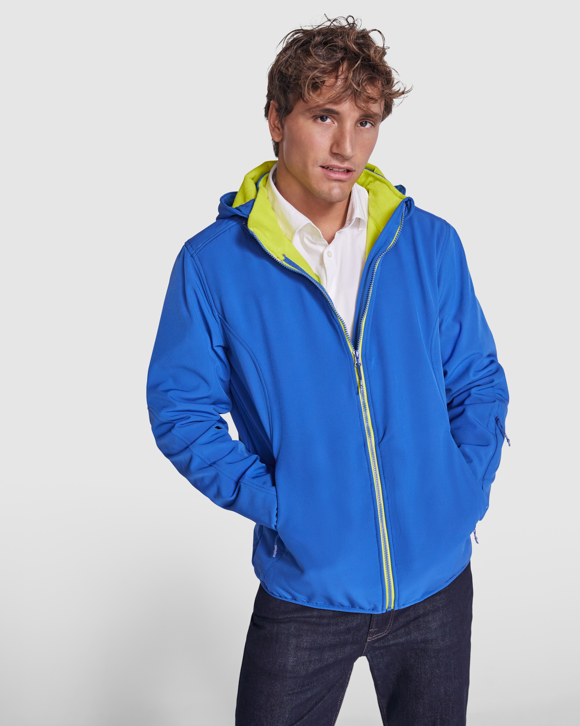 Softshell compuesto de 2 capas con corte deportivo. Cremallera central a contraste con protector de barbilla y tirador. Forro interior en tejido micropolar a contraste. Cuenta con bolsillo exterior en pecho derecho con cremallera invisible con forma diagonal, dos bolsillos exteriores laterales con cremallera invisible, y un bolsillo en manga izquierda. Ribete elástico a tono en puños y bajo. Capucha extraible con forro micropolar a constraste.