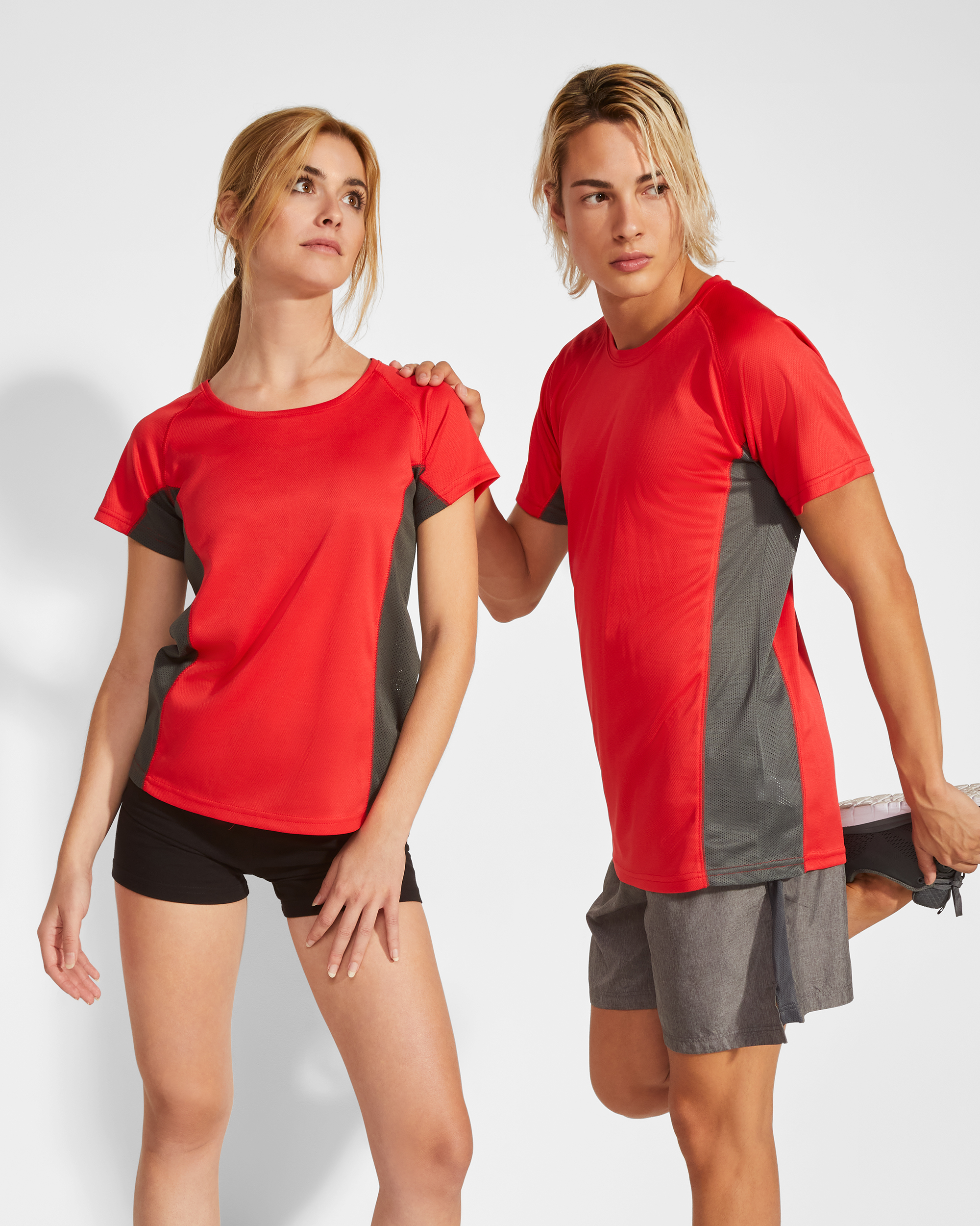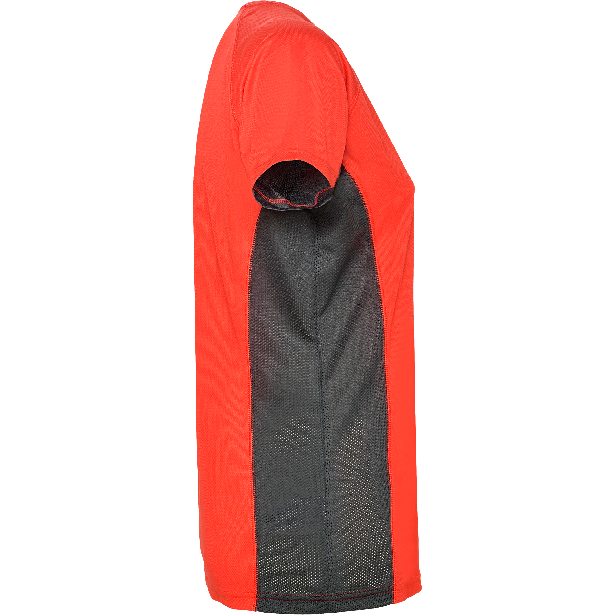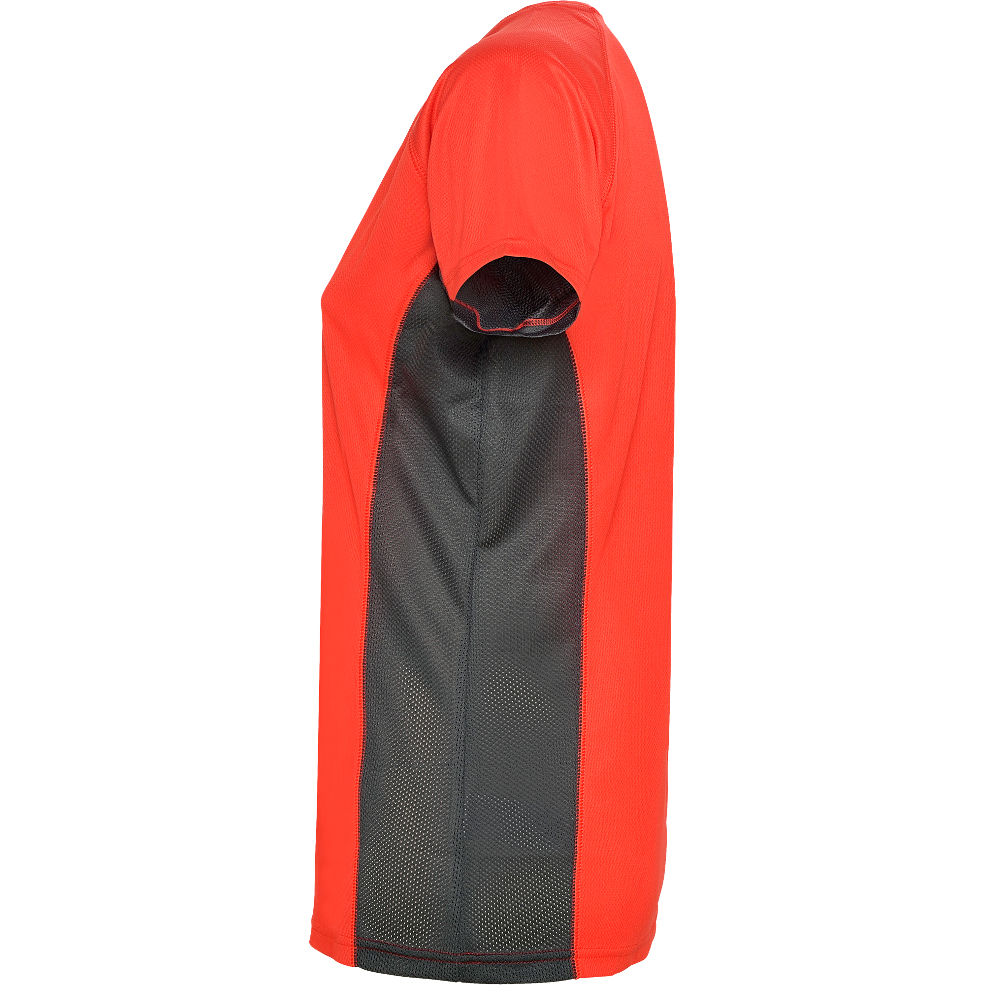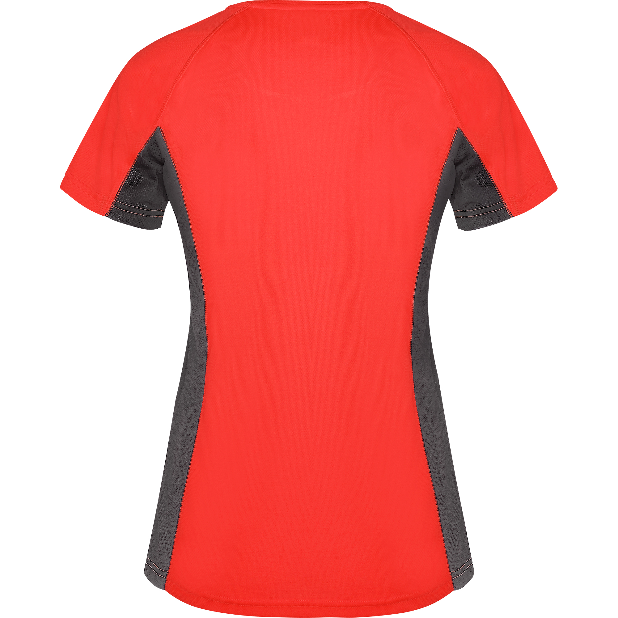 Camiseta técnica combinada con dos tejidos de poliéster, manga corta de estilo ranglán. Tejido principal bird's eye y paneles laterales e interior de la manga con tejido microperforado. Cuello redondo con cubrecosturas de refuerzo en su interior. Camiseta de tejido confortable y fácilmente adaptable al cuerpo.