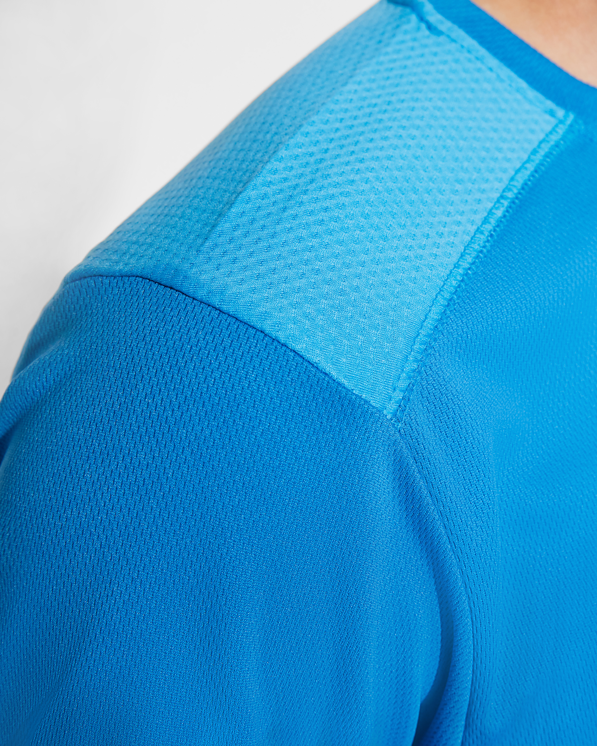 Camiseta técnica de manga corta, con cuello redondo. Combinada en espalda y hombros con dos tejidos de poliéster. Tejido principal frontal bird´s eye y tejido rejilla 3D transpirable en la parte trasera. Tejido preparado para la absorción de humedad. Pespuntes decorativos zigzag en hombros y costados frontales. Patronaje en la espalda ligeramente mas largo.