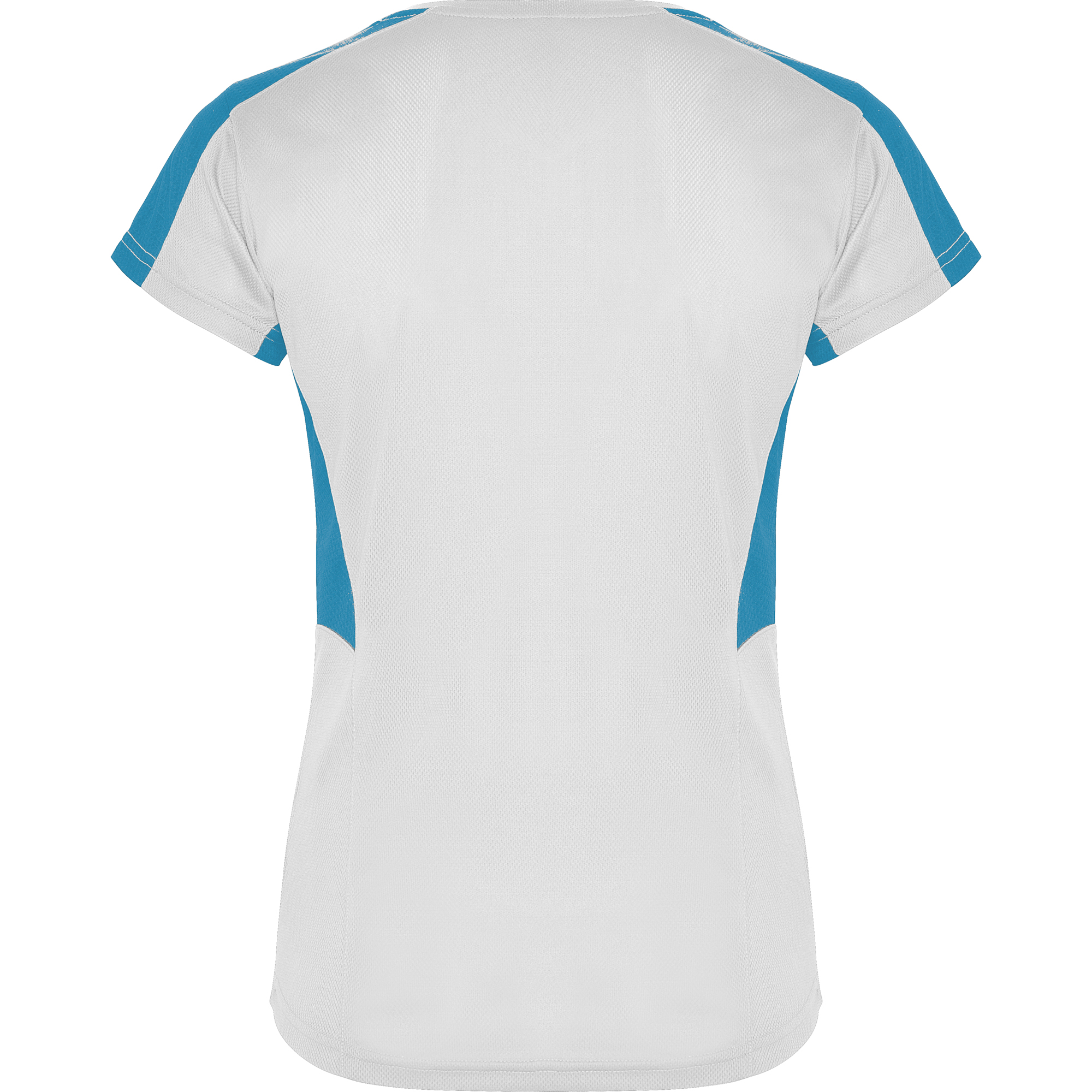 Camiseta técnica de manga corta para mujer con cuello pico. Combinada en laterales y hombros con dos tejidos de poliéster. Tejido principal bird´s eye y tejido rejilla 3D transpirable en hombros y paneles laterales. Tejido preparado para la absorción de humedad.