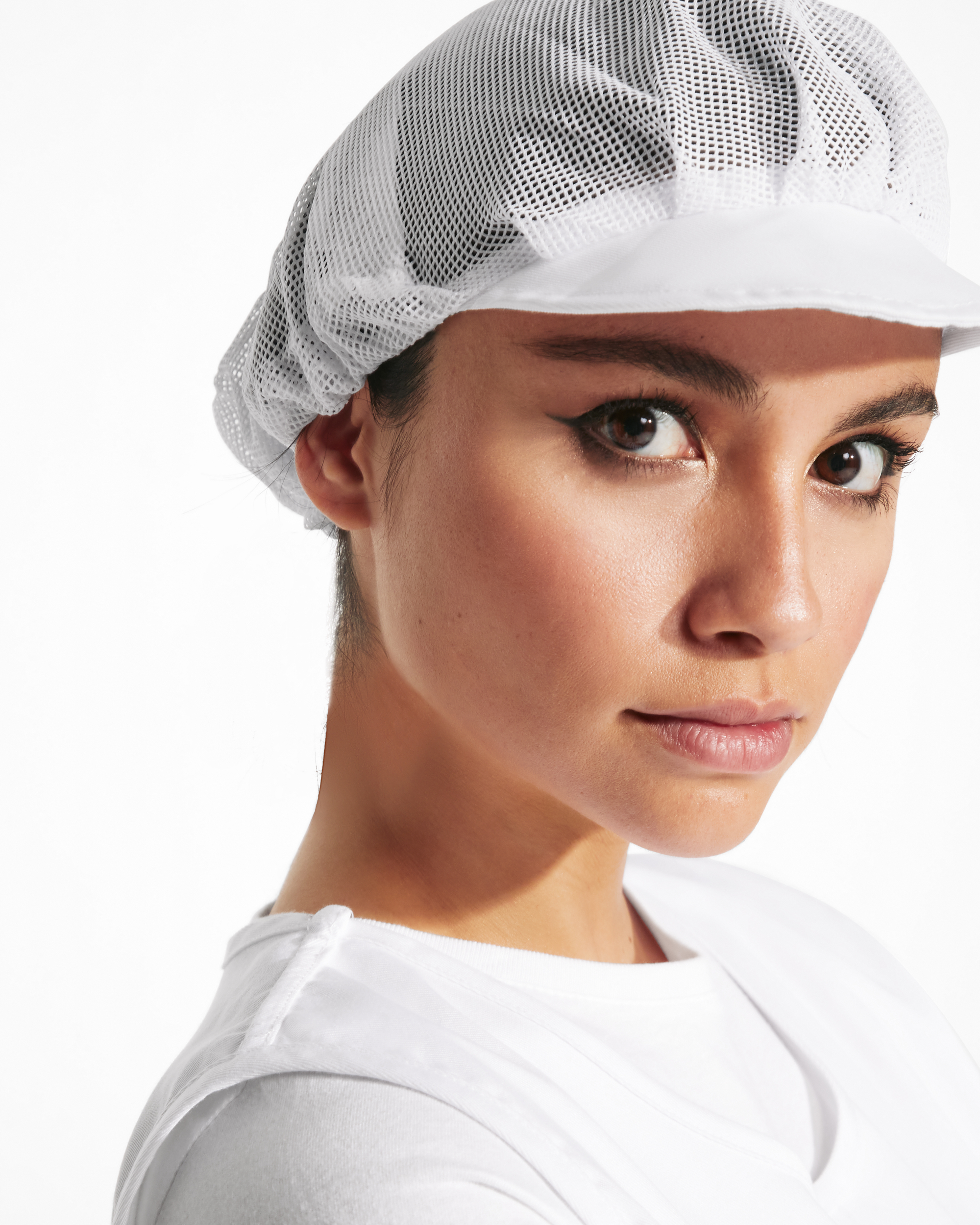 Cofia con rejilla recoge pelo y visera corta rígida.