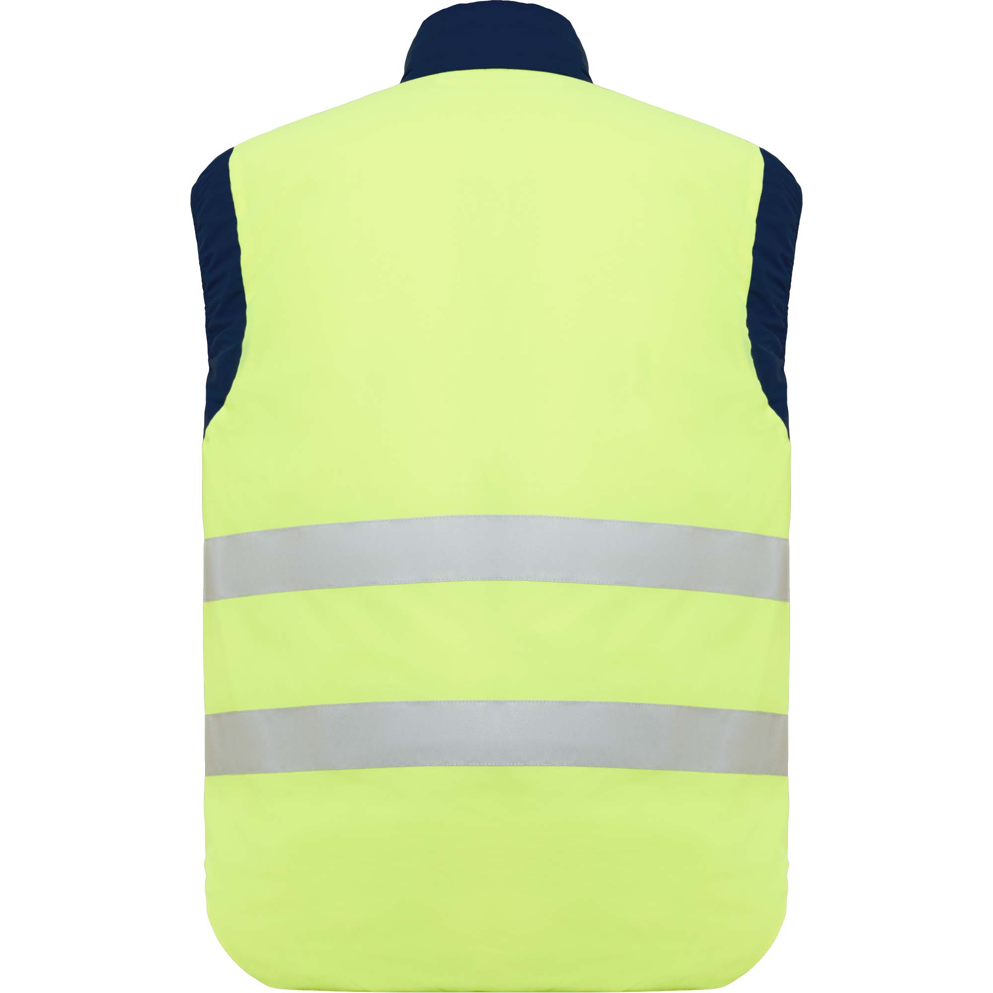 Chaleco reversible multibolsillos y alta visibilidad, con cuello alto.